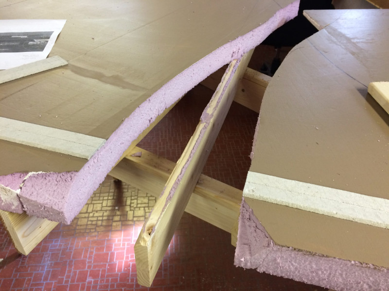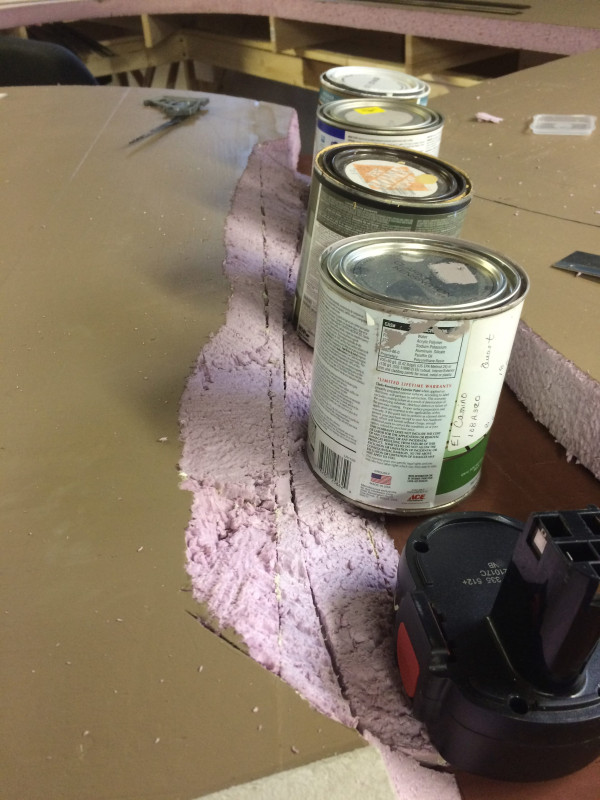 I installed a 1/4 piece of plywood as a river bed and carved the foam into a more natural bank. The sections I cut off were inverted and glued below the cut to form the bank profile.