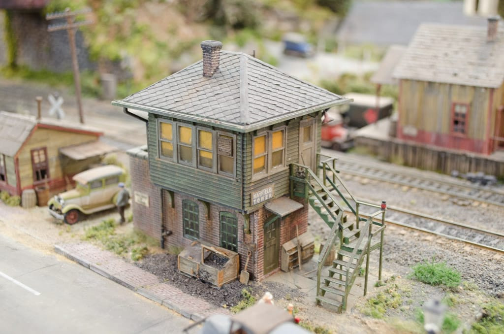 The signal tower here is an Atlas kit number 704 ... I built a wooden deck around the tower, changed the staircase, changed the angle of the roof, painted it different colors and added details all around it.