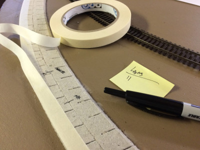 Three scale inches is 7 layers of 1/2" masking tape. Now, 3 scale inches may seem hardly worth doing, but getting eye-level with the track and rolling a test car around the bend looked sweet! Just enough rake to simulate the mass of locomotives and rolling stock. Since I want to do a lot of photography with the layout, this is the look I was going for.